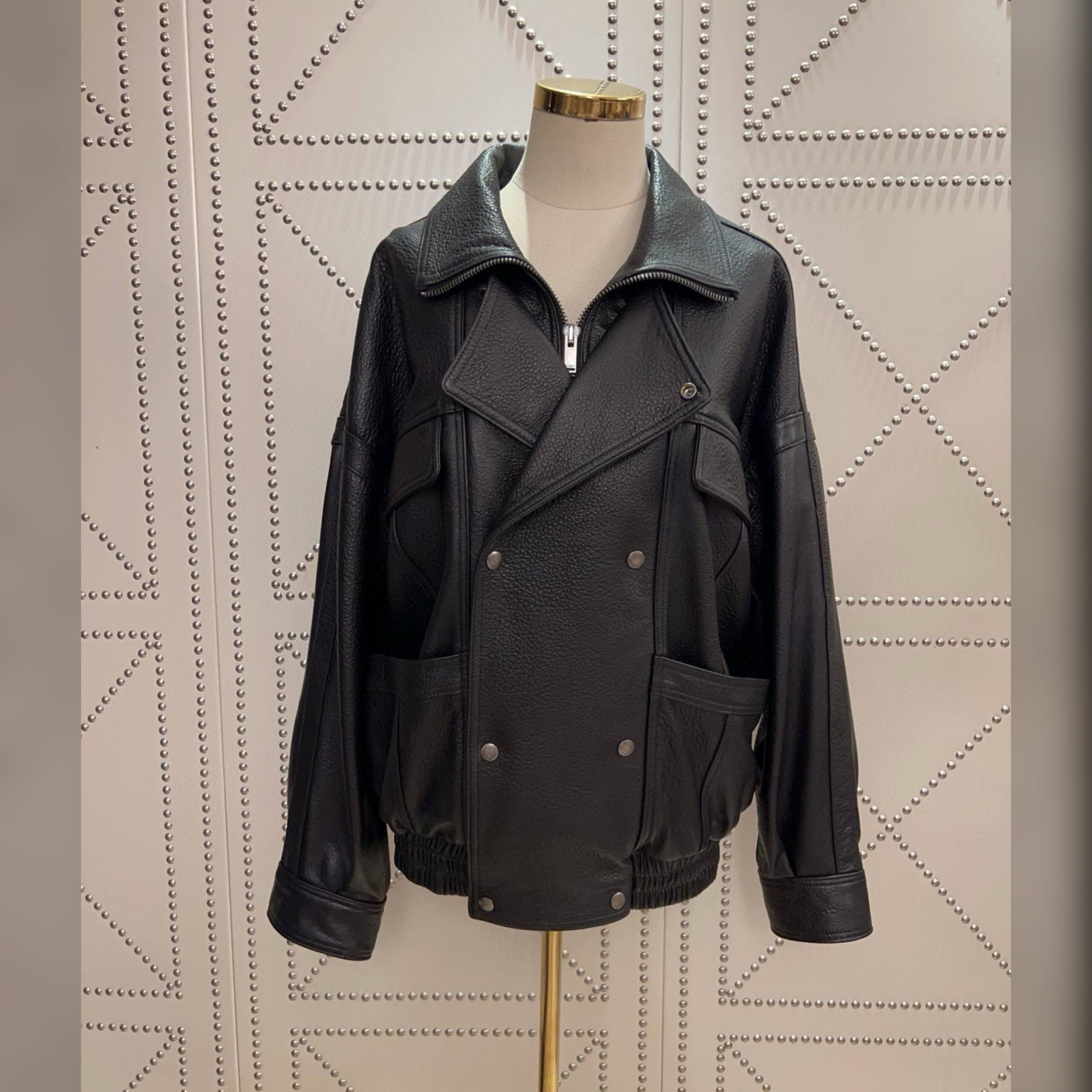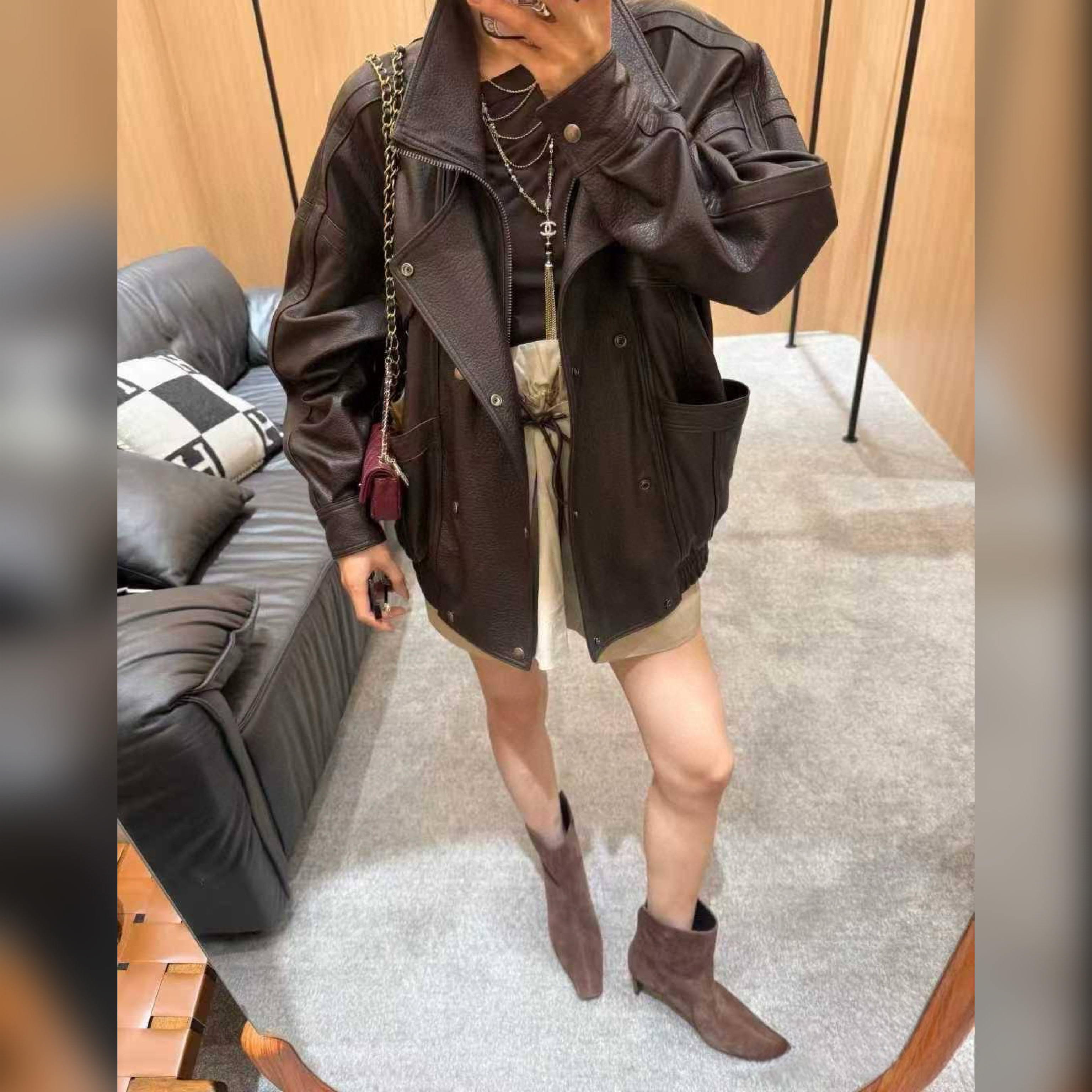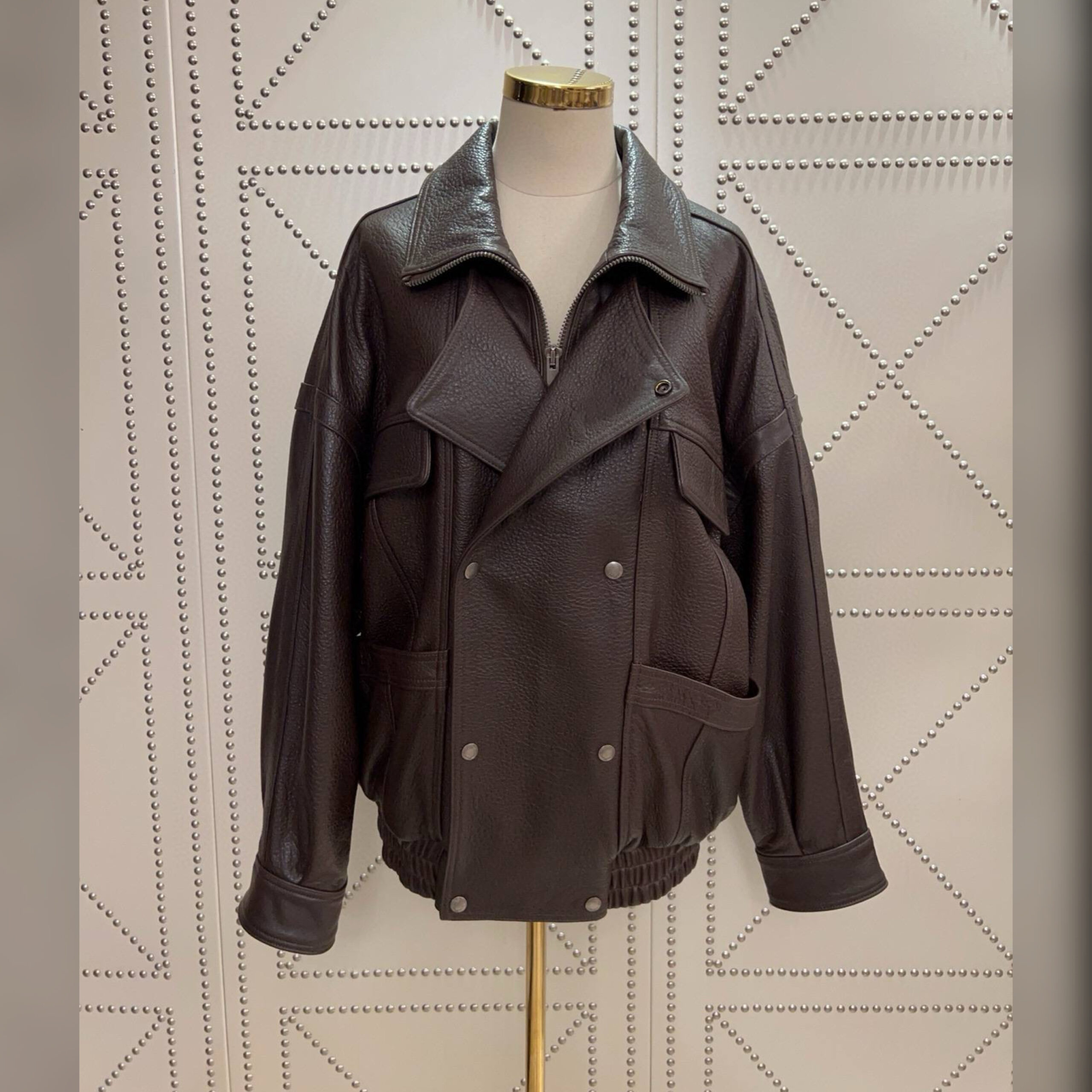 Куртка с высоким воротником и эластичным поясом дополнена двумя накладными и двумя прорезными карманами снаружи. Для пошива изделия с молнией, прикрытой штормовым клапаном на кнопках, использовали кожу ягненка с выраженной фактурой.