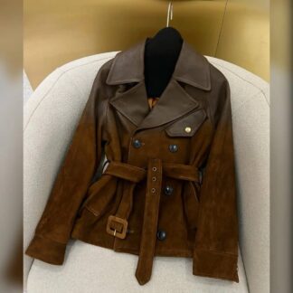 Куртка из тонко выделанной замши составит гармоничный дуэт с брюками. По бокам модель дополнили врезными карманами, а талию подчеркнули ремнем в тон. Изделие на тонком подкладе застегивается пуговицами.