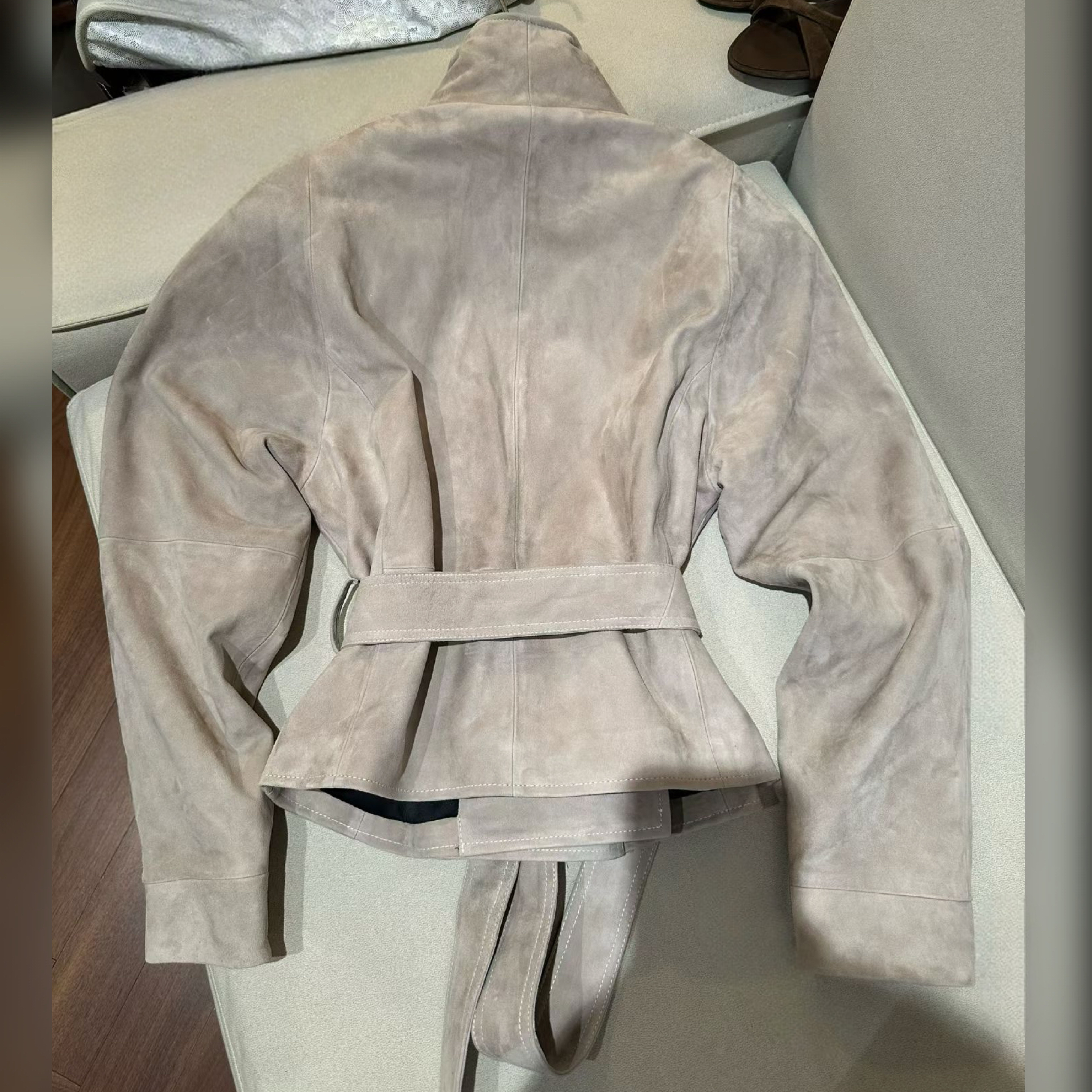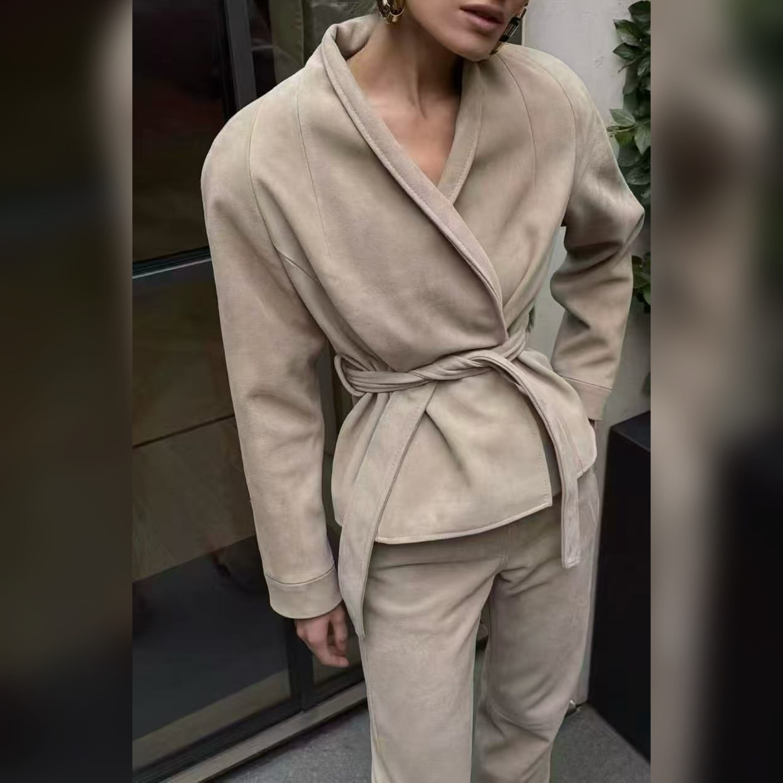 Замша отвоевывает позиции у классической черной кожи. Куртка из такого прочного, слегка эластичного материала ручной выделки органично впишется в образ как в светлой, так и в темной гамме. Сестры Олсен сделали модель с v-образным вырезом женственнее, дополнив ее завязывающимся поясом-лентой, акцентирующим внимание на талии.