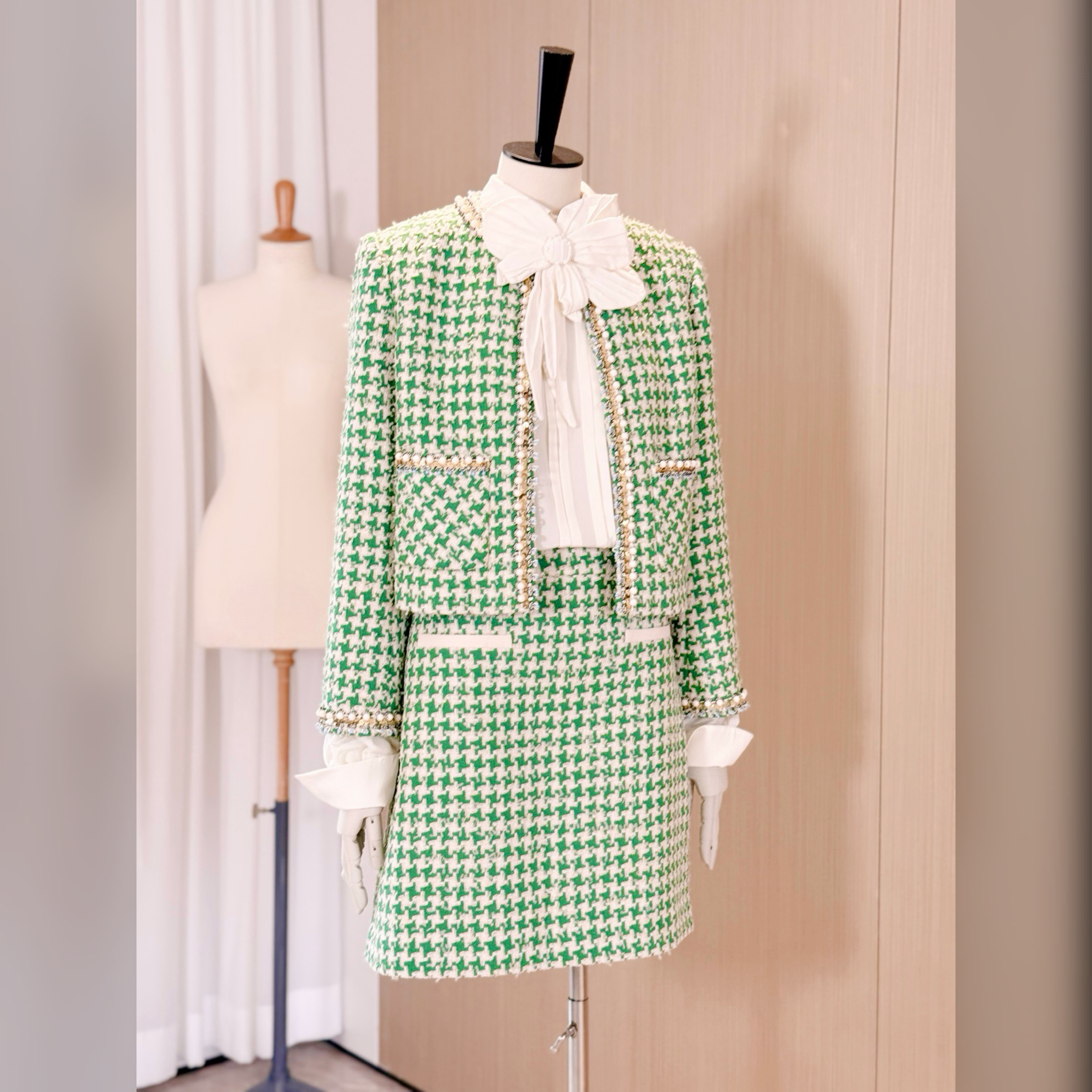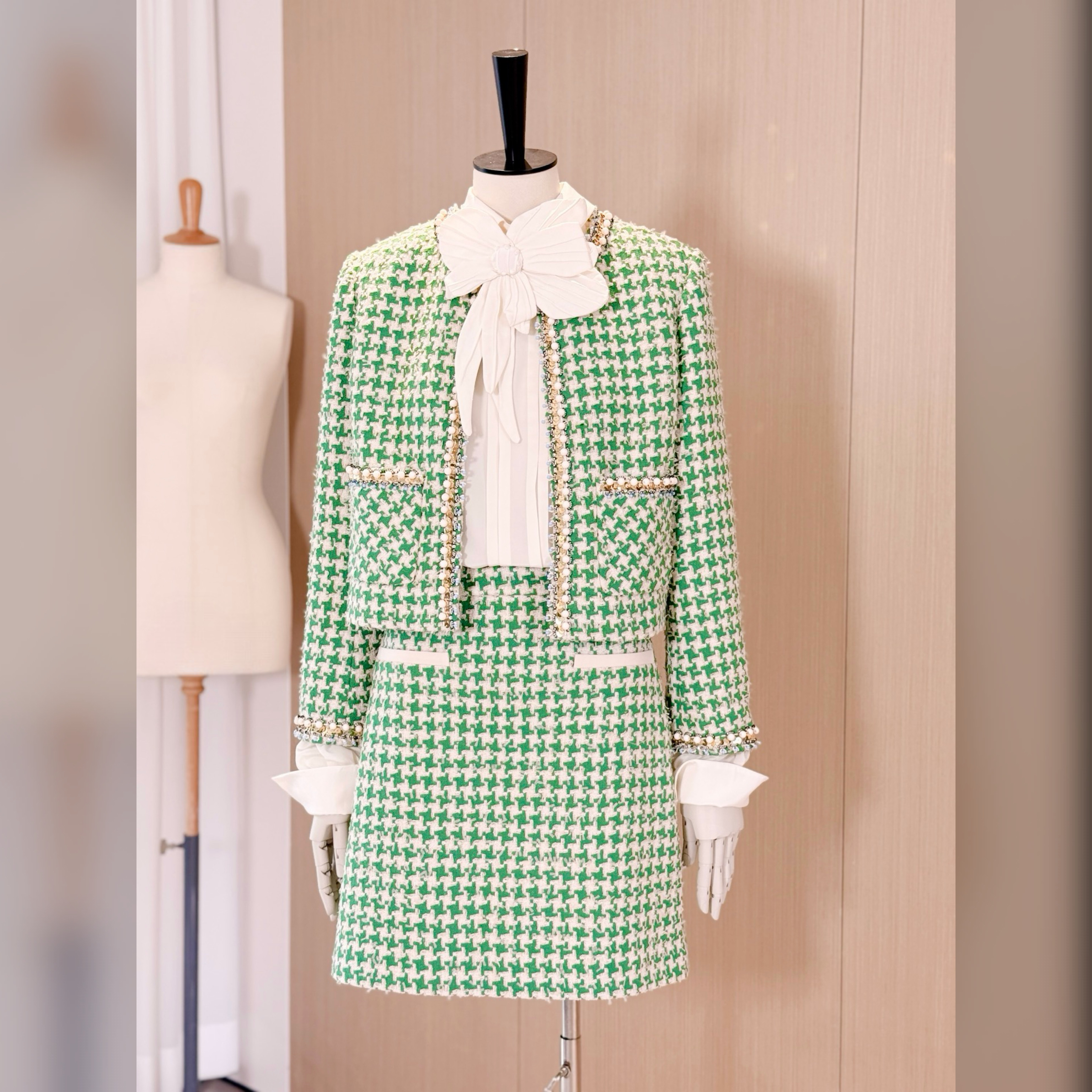 Юбку А-силуэта выполнили из смесового твида с крупным узором «гусиная лапка». Модель с широким поясом и парой листочек спереди застегивается потайной молнией сбоку.