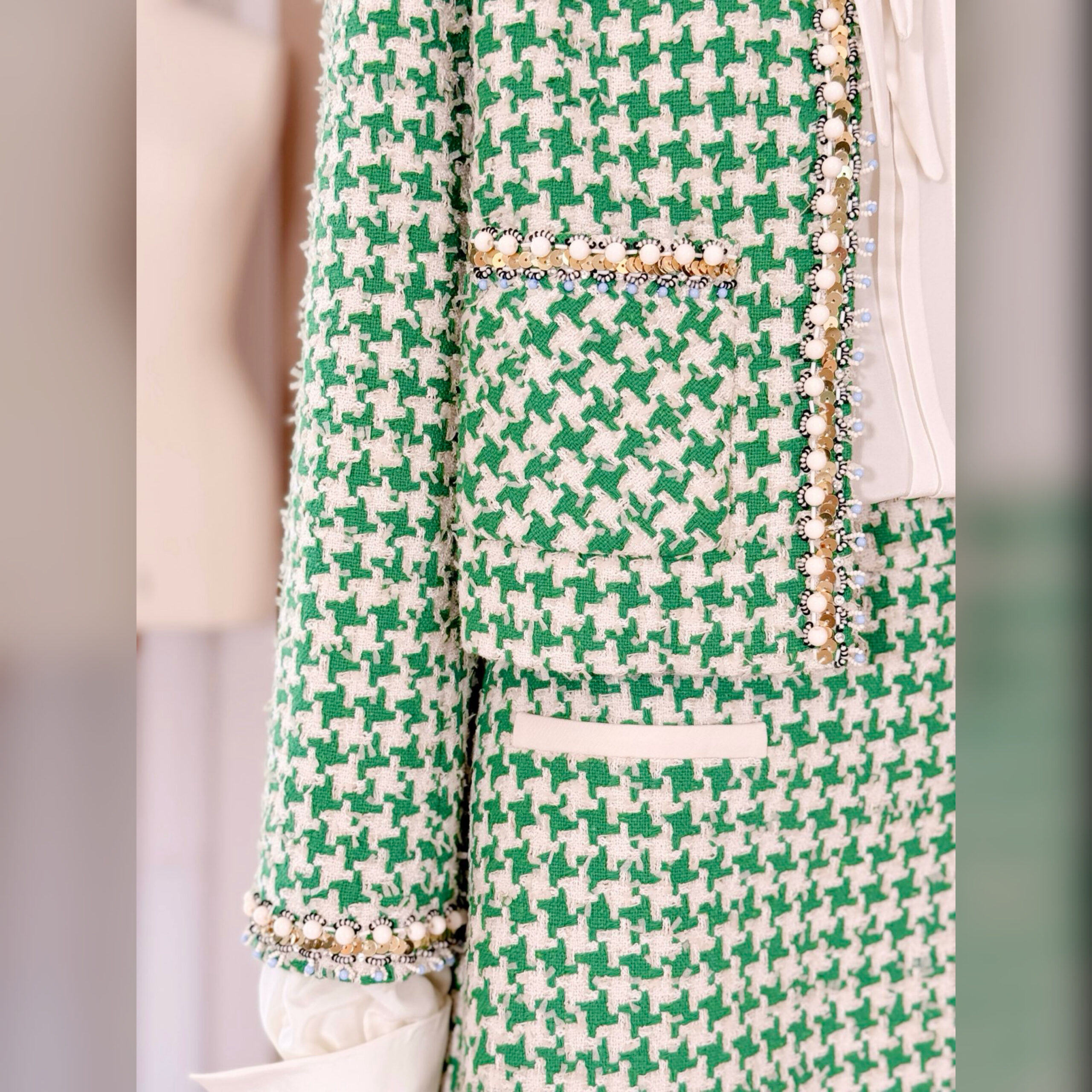 Жакет с отделкой из пайеток, бисера и бусин впишется в образ с парной мини-юбкой. Яркую модель прямого кроя сшили из твида. На изделии с круглым вырезом предусмотрели пару накладных карманов.