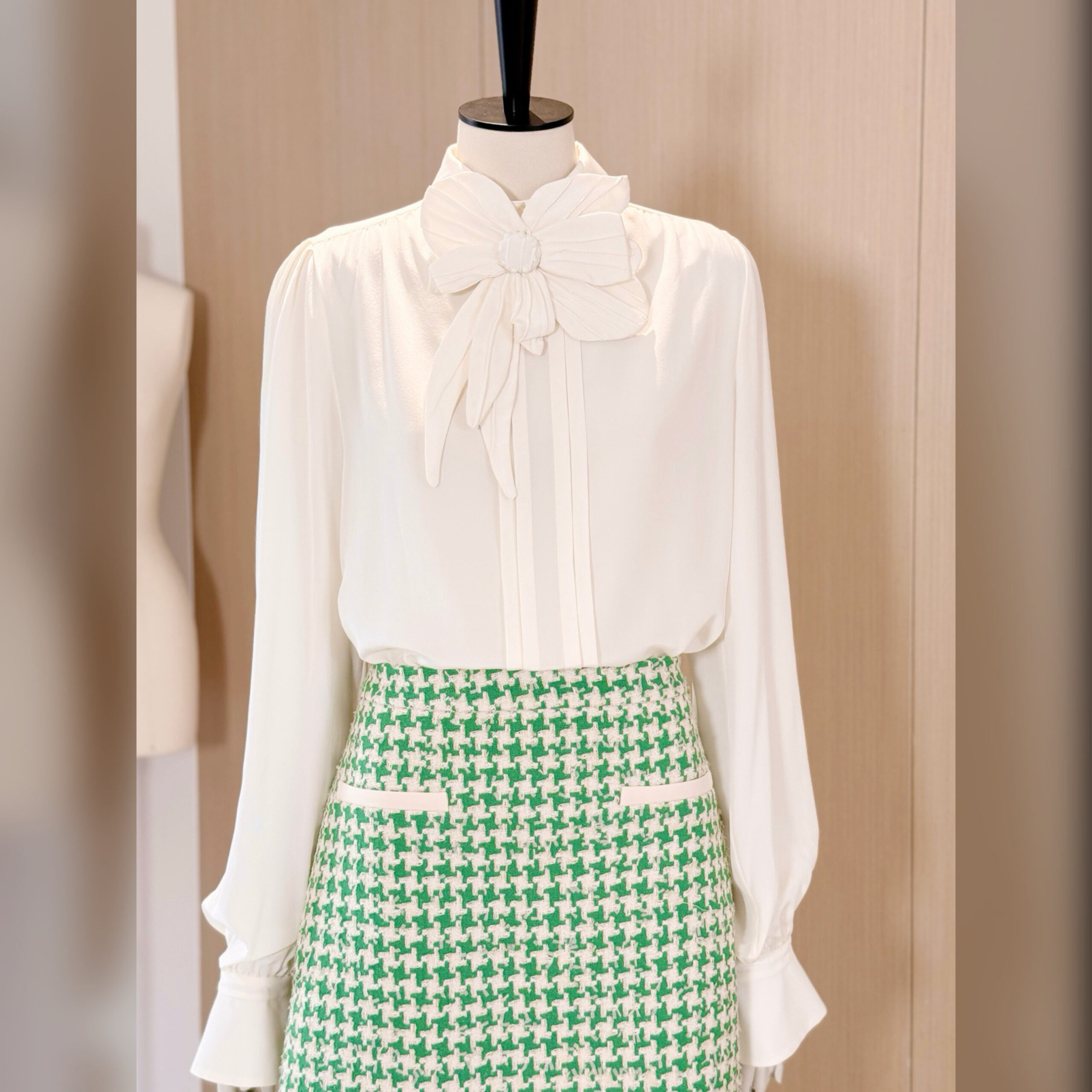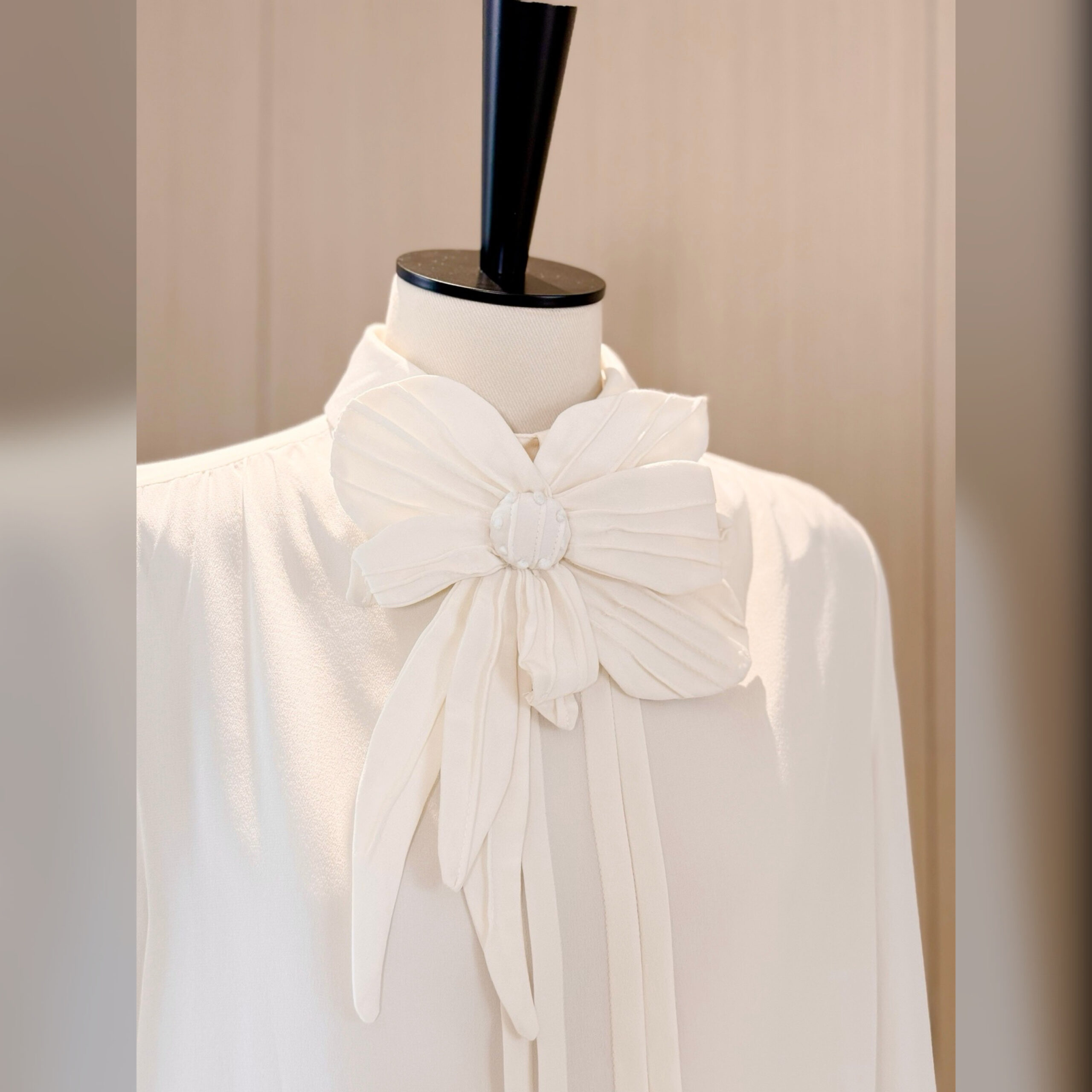 Блуза молочного оттенка с объемными рукавами и изящной драпировкой — квинтэссенция женственности.