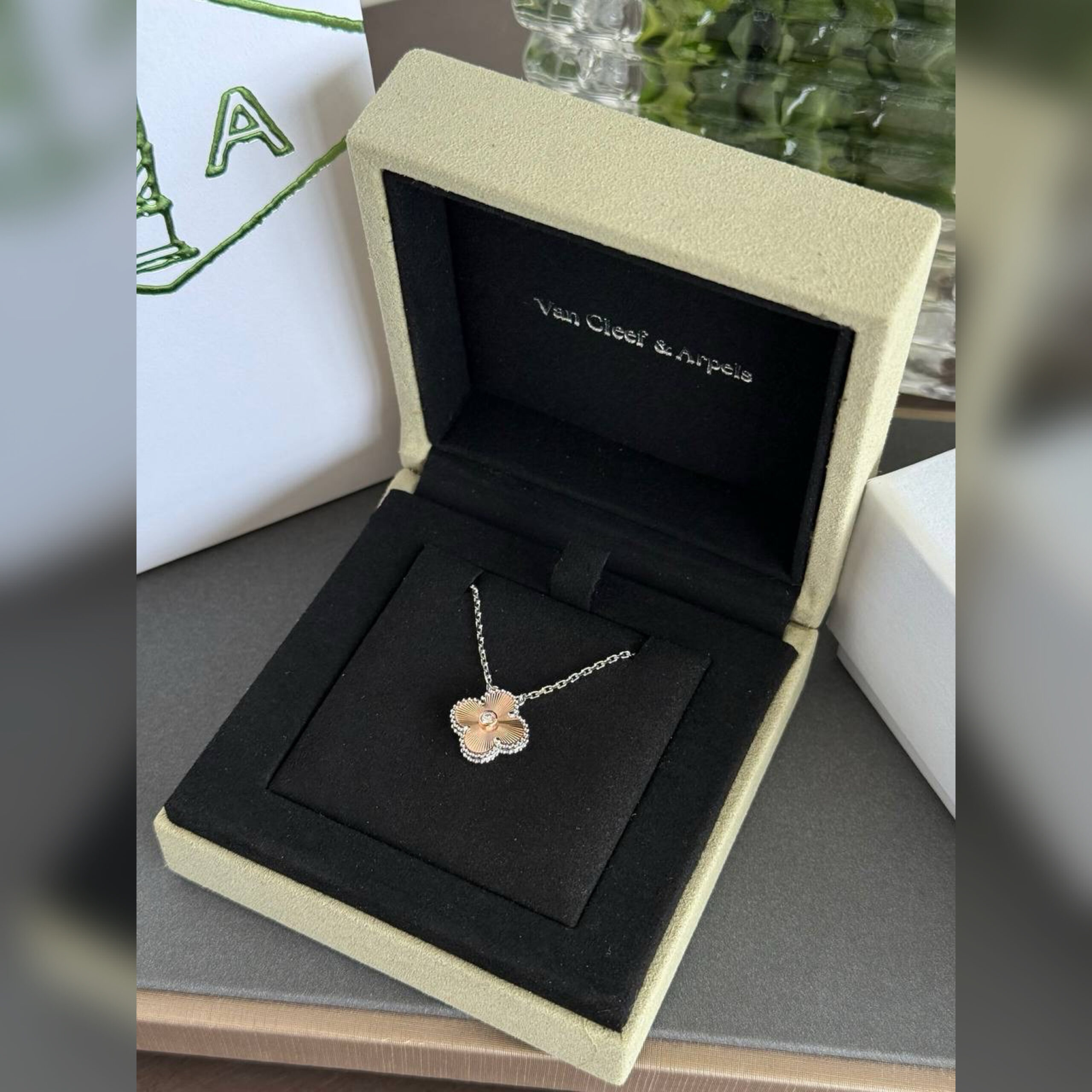 В комплекте бархатная шкатулка, коробка, документы, ленты и пакет Van Cleef.