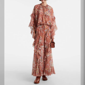 Свободную блузу с широким подолом украсили нежным цветочным принтом. Глубокий V-образный вырез и объемные рукава и нижний край отделали ажурным кружевом.