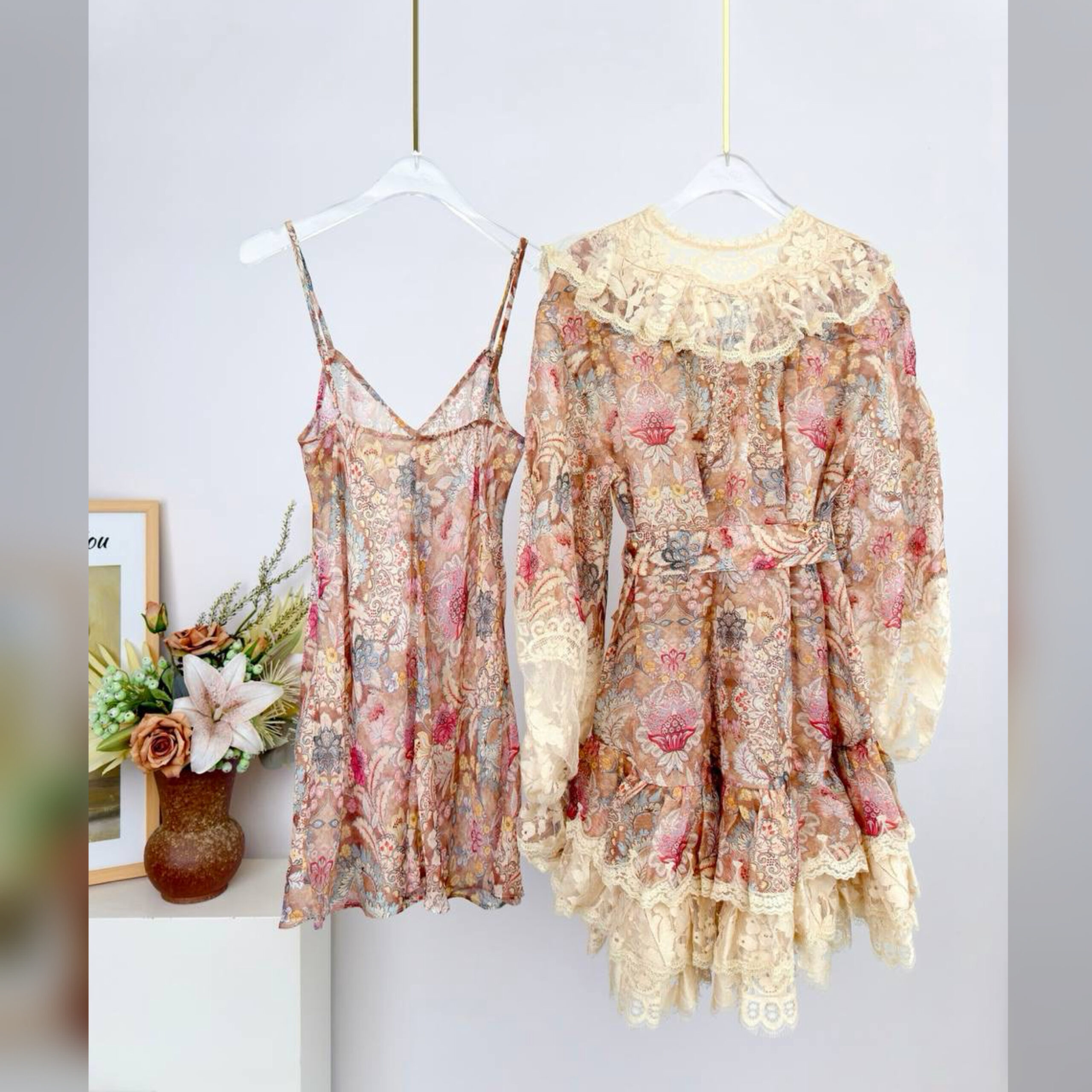 Мини-платье Rebellion, выполненное из полупрозрачного шелка и льна, имеет глубокий V-образный вырез, регулируемый шнуровкой. Изделие дополнено длинными объемными рукавами с эластичными манжетами и многослойными оборками на вырезе, манжетах и подоле. Нижнее платье, включенное в комплект, снижает градус провокации.