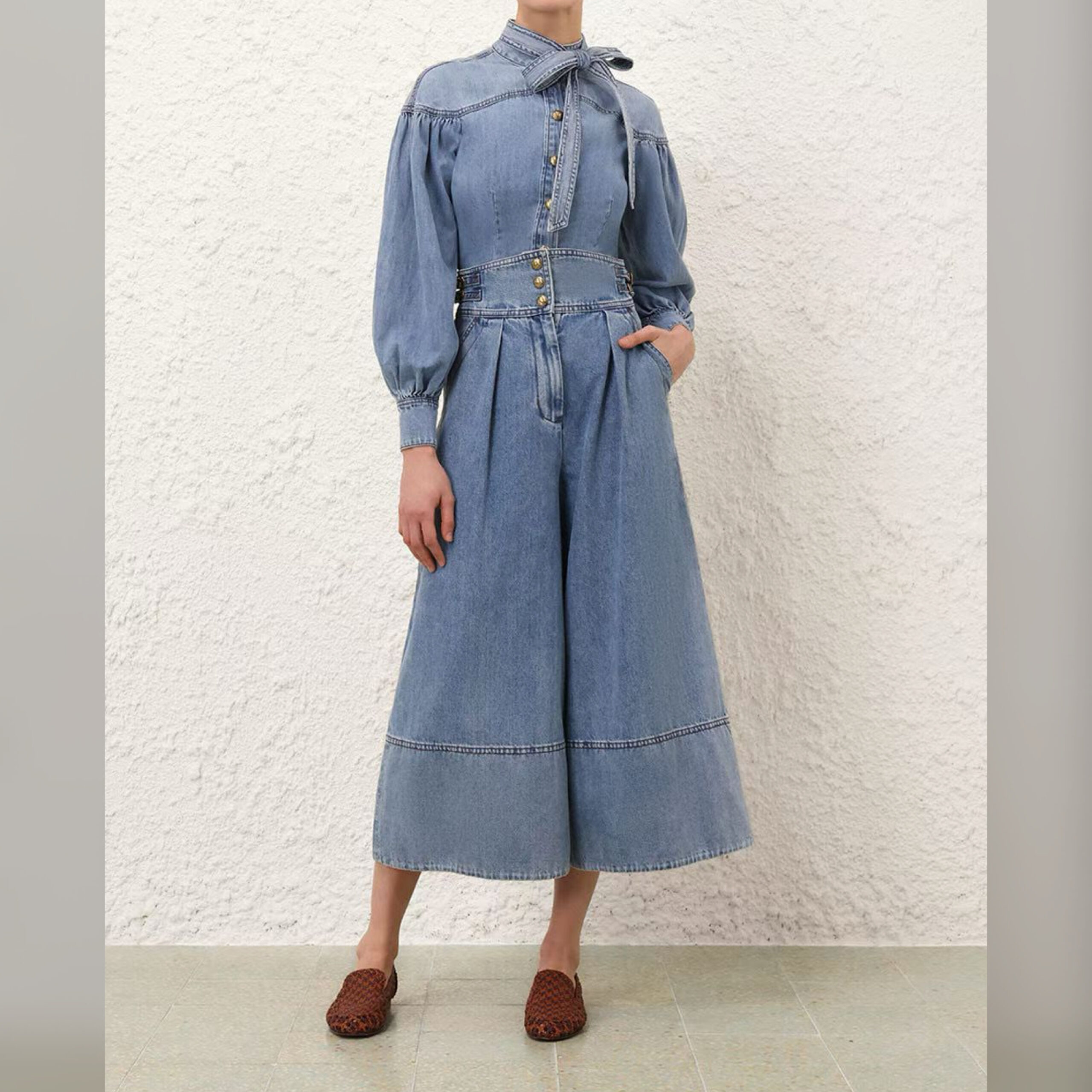 Свободные голубые кюлоты из весенне-летней коллекции зададут расслабленное настроение повседневному образу с рубашкой в тон. Для пошива модели с высокой посадкой Ники Циммерманн выбрала мягкий и при этом очень прочный японский деним премиального качества. Чтобы создать легкий эффект делаве, который со временем станет более выраженным, готовое изделие постирали с камнями.