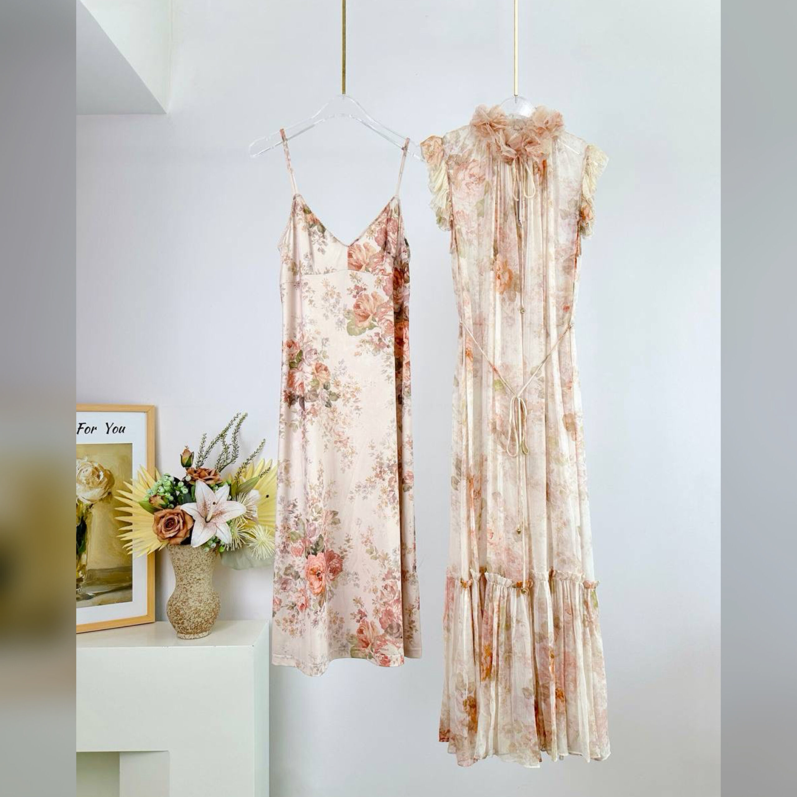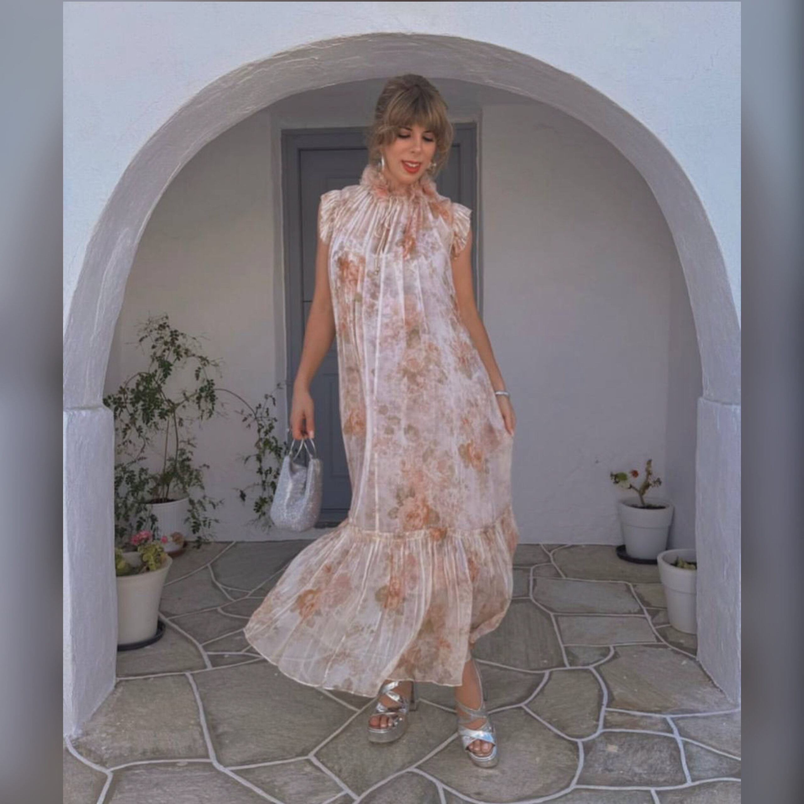 Платье-макси выполнили из полупрозрачной ткани с растительным принтом. Модель с завязками на воротнике дополнили тонким поясом-шнуром. В комплекте – нижнее платье.